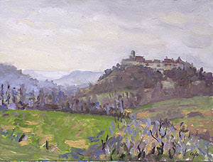 Tournon d’Agenais (47) 30 x 40 cm. Oil on Canvas Board. sold ©adam cope cold day village perchée = literally village perched on top of a hill, in a defensive position..