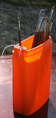 Here’s one I cobbled together (ML thought I had really gone funny when she saw me rushing about the house all excited about… a plastic box ). It doesn’t fit neatly ino my french easel unlike how the smart guerilla hang-up fits well into the integral guerilla system. The result of which is that my improvised hang-up hangs around extraneously & is one more bit of kit to carry (drop). You get what you pay for. One day I will have a guerilla to carry my hang-ups.