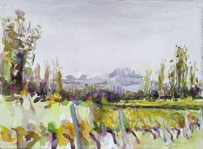 Last parcel of sauvignon yet to be harvested. Autumnal overcast sky, grapey mauve, the landscape mellow with misty stratus, a bluey shade of manganese mauve. Last brave yellow tops of vine leaves. Yellow ochre bottoms heavy with mauvey blue grapes. Trees thinning out already.
