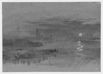 Here’s the above painting desaturated in Photoshop via greycale (does anyone know why this should give a different result than desaturation via contrast (diminished to zero)?). The sun doesn’t disappear into the sky. This makes sense as yellow suns happen before red suns in a sun set & thus are higher in the sky & brighter than red suns … Maybe Turner’s yellow sun on red sky is an impossibilty, a construct of the Master of Spectacular Metrology? But then the sky is sometimes so spectacular that I have difficulty beleiving it myself, and don’t expect anybody looking at a painting to belive it either Actaully there’s fault here: most peple haven’t spent as much ime observing the skies as I have… this tends to be a countryside things, and most people live in urban settings, where the sky is difficult to see well & unobstructed. Another example of the human race becoming removed from the non human natural enviroment..