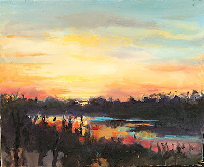 There’s another Levitan sunset which I can’t find on the web. It’s a weak red sun against a steely blue sky over a marsh. I don’t trust the colour repro in the above photo but I like the how the sun is just about to sink below the the bar of stratus clouds & hence is just about to loose it’s perfect roundness.