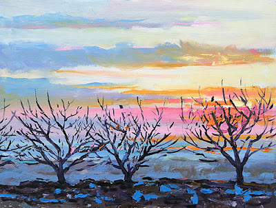 Painting in sub-zero temperatures a month ago…finished off in studio, the gradients of light were wrong, there wasn’t such an abrupt change from yellow to pink but rather slipped through orange to pink. difficult to follow these rapid changes whilst froz & anyway the trees where so stark & black against the light, they needed do ‘afterwards’, after the sky, sequently more like a watercolour than an oil.